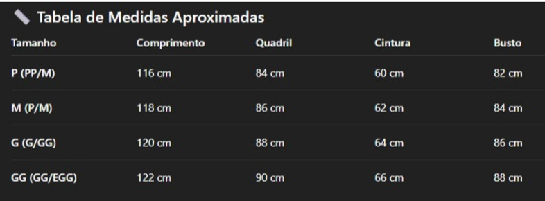 Tamanho G (G/GG): Comprimento 120 cm, Quadril 88 cm, Cintura 64 cm, Busto 86 cm